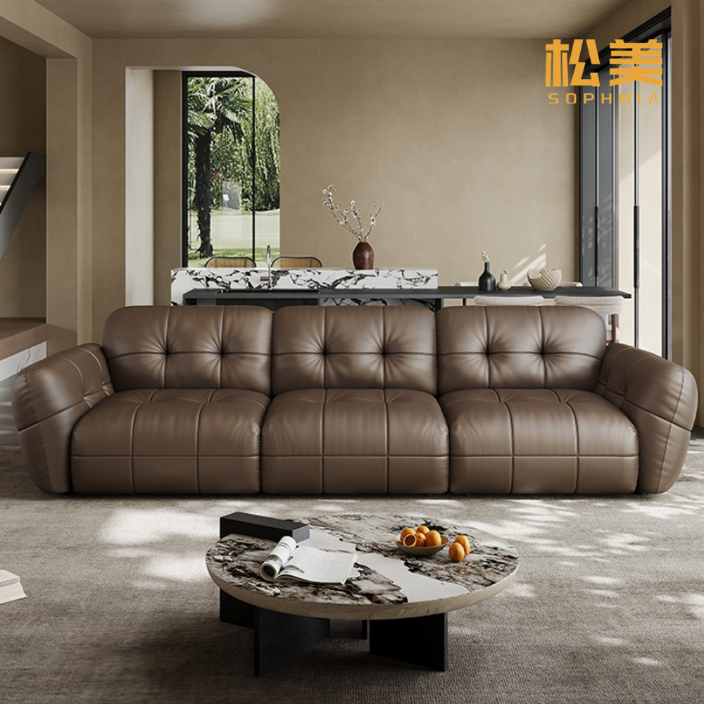 Our Tofu-block-style leather sofa, crafted with premium genuine leather, combines minimalist aesthetics, luxurious texture and exceptional durability, making it a standout centerpiece for any Home. This Sofa features a sleek tofu-block silhouette with clean lines and smooth leather touch, delivering unparalleled comfort while bringing a sense of modern sophistication to your living space. Its compact yet practical design offers ample seating space, perfectly meeting the needs of family gatherings and casual relaxation. As a fashionable piece of Home furniture, this tofu-block-style leather Sofa seamlessly complements various interior decors, especially modern minimalist, Scandinavian and industrial styles. It harmonizes perfectly with other furniture such as Bed and Upholstery items, creating a unified and high-end living atmosphere. The robust solid wood frame ensures strong stability and excellent load-bearing capacity, while the high-density elastic sponge filling enhances seating…