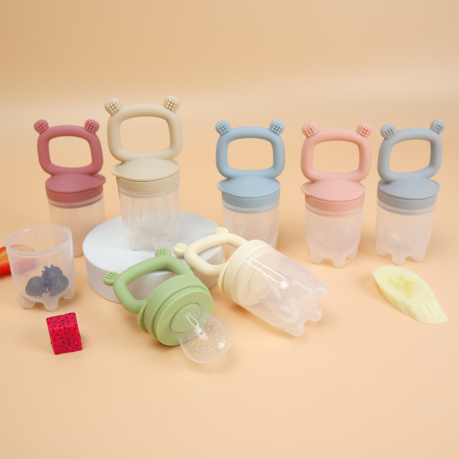 Bear-Shaped Silicone Fresh Food Feeder & Freezer Tray Set | 2-in-1 Teething & Feeding Essential All-in-one solution for safe feeding, teething relief, and baby food storage Product Overview This adorable bear-themed bundle combines a silicone pacifier fresh food feeder and a silicone freezer tray to simplify feeding and teething care for your little one. The fresh food feeder doubles as a silicone teether and teething pacifier, serving as a fruit pacifier to introduce fresh flavors while soothing swollen gums. Paired with the leak-proof silicone freezer tray, you can easily make and store frozen purees or teething treats —making this set one of the best pacifiers for newborns and a must-have addition to your baby feeding toolkit. Key Features Bear-Shaped Silicone Fresh Food Feeder 3-in-1 Functionality: Acts as a silicone pacifier, silicone feeder, and silicone teether—use it as a mesh feeder for fresh fruits, a fruit teether for teething relief, or a calming newborn paci…