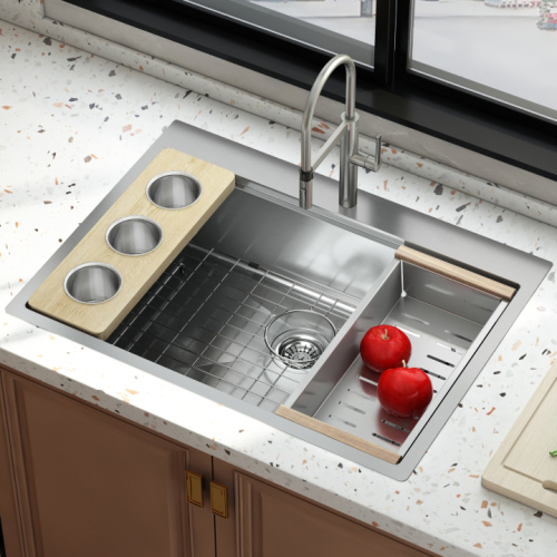 550mm Black Handmade Single Bowl Outdoor Bar Kitchen Sink Meiao handmade kitchen accessories and sinks, including undermount sink, topmount sink, apron sink and others. This PVD NANO black handmade stainless steel kitchen sink is defined by sleek lines, offering a clean transitional look that blends perfectly with any kitchen style. The kitchen sink is contructed with dent-resistant SUS304 stainless steel in real 16-gauge for superior strength and durability. Rust & Stain Resistance. Plus corners below ledges require low maintenance in daily use to keep stainless sink sparkling and hygienic forever. Multipurpose sinks can be satisfied in farm and kitchen. Product Details STAINLESS STEEL HANDMADE SINGLE BASIN BAR SINK: BLACK Size 550mmX450mmX200mm Color Black T…