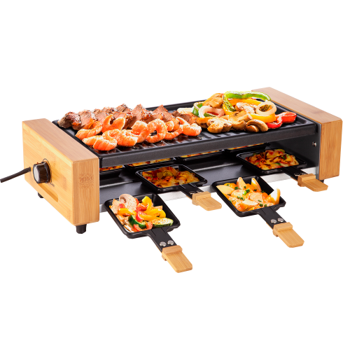 Our new product,a new disign Electric raclette grill, adopts pure natural bamboo as the outer shell, designed as trapezoids on both sides. The appearance is beautiful and practical, while also ensuring that users are not scalded by high-temperature baking plates.The barbecue board adopts an integrated aluminum casting process, and the surface coating is a non stick coating. The baking board is designed with two sides and one side has a pit pattern design to avoid a large amount of oil adhering to the food, ensuring health. On the other side of the grill, there is a graphic design. Make the food heated very evenly during heating. Energy saving and health are our consistent principles. Our Electric raclette grill with 8 mini pans. 8 people can cook at the same time. Mini pan can be used to grill vegetables, cheese, eggs, minced meat, and more together. Use your imagination as much as possible to bring more fun to cooking. Model BC-08GB1200 Power 1200 W Voltag…