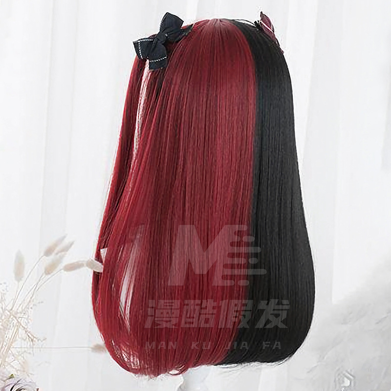 1.Unique Design This wig features a distinctive jellyfish - hime style. It combines two bold colors, black and red, in a split - design. One side showcases a sleek black, while the other flaunts a vibrant red, with a braided section on the red side adding an extra touch of detail. Adorned with two cute bowknots at the top (in matching dark tones), it perfectly captures the charming and somewhat gothic - lolita aesthetic of the jellyfish - hime hairstyle. The long, flowing lengths on both sides and the shorter, face - framing front create a soft and alluring silhouette, ideal for those seeking a standout look for cosplay, themed parties, or daily fashion experimentation. 2. High - Quality Material Crafted from premium synthetic fibers, the wig offers a natural - looking sheen and soft texture, closely mimicking real human hair. These fibers are resistant to tangling and shedding, ensuring the wig maintains its neat and stylish appearance even after multiple wears. They also have good…