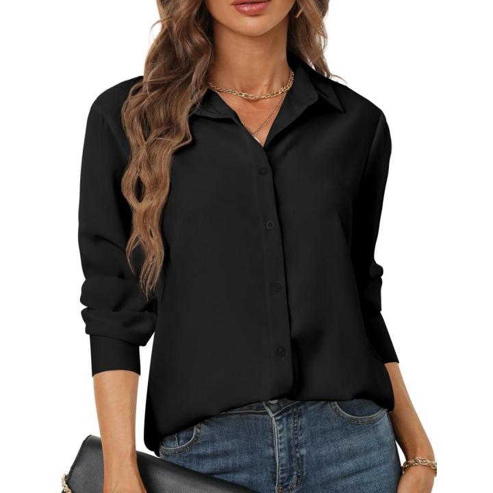 Women's Button Down Shirts Soft Polyester Chiffon Long Sleeve Shirt Fold Pleated Back Solid Workwear XS-XXL