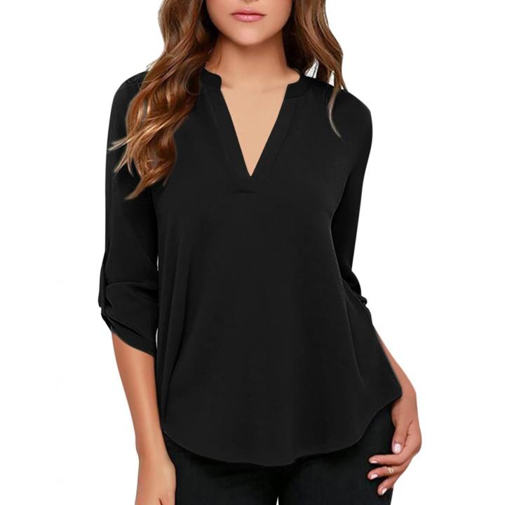 Women's Chiffon V-Neck Business Casual Blouse Work Tops with Cuffed Sleeves